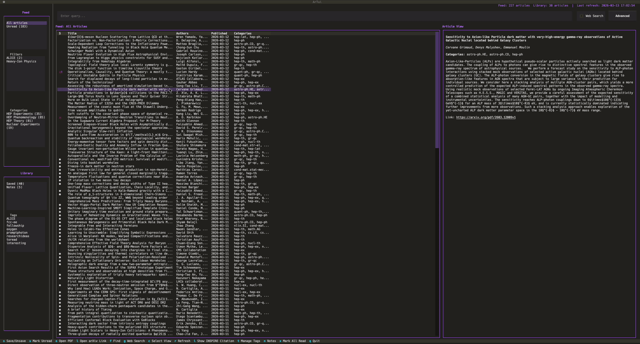 arTui is a terminal user interface for keeping up with recent arXiv submissions from within the console.