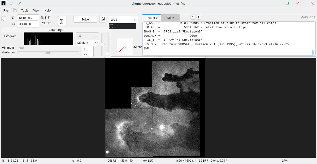 - Mosaic building covering large areas using the astrometric linear solution WCS or WCS+SIP polynomial.