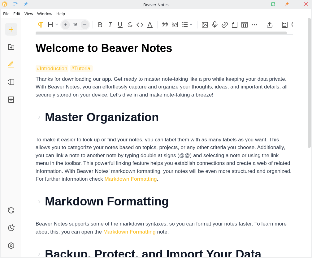 Beaver Notes is a privacy-first note-taking application that helps users capture ideas, organise knowledge, and connect related notes while keeping data local by default.