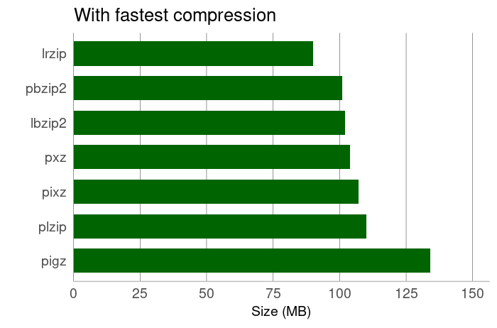 If you need to compress large files on a machine with a low powered multi-core machine, the fastest compression might be suitable. pigz compressed the 537MB tarball to 134MB in a whisker under 1.7 seconds. Most of the other tools shaved the tarball to around 100MB, and lrzip compressed the file to a mere 90MB.
