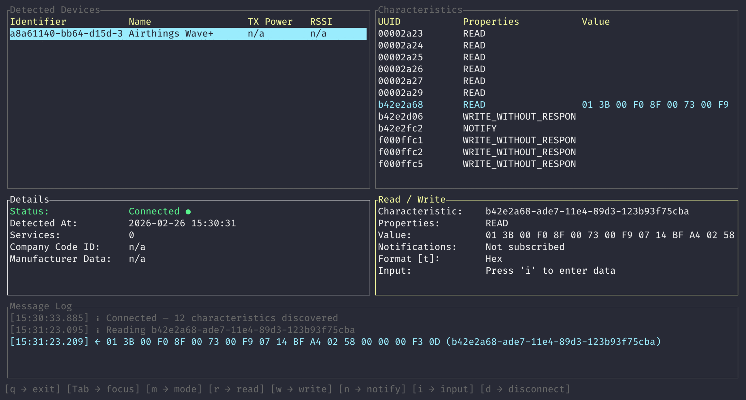 - Read / Write — Read characteristic values or write data in hex or text format.