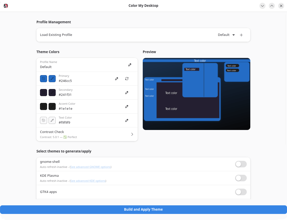 Color My Desktop is an easy to use tool for creating, managing, and applying custom color palettes to custom generated themes for the gnome-shell/ KDE-Plasma / GTK4 apps.
