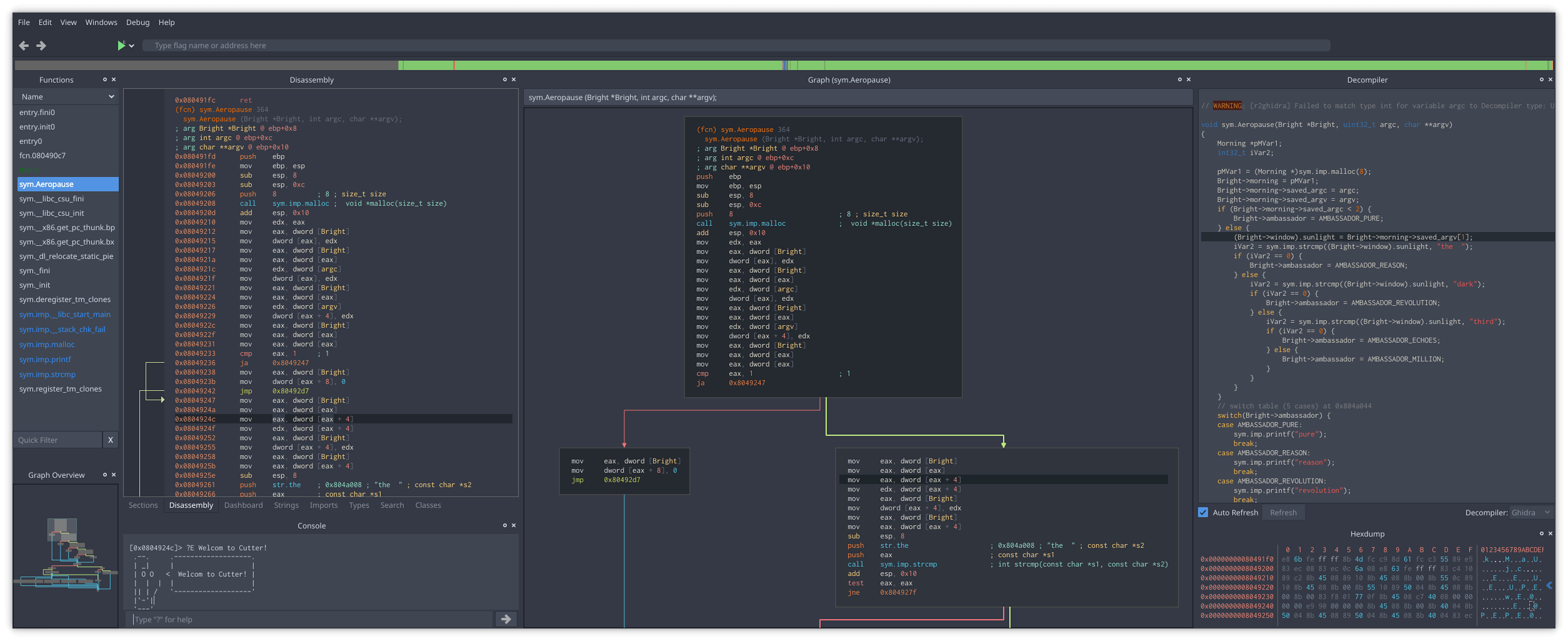 Cutter is a graphical reverse engineering platform designed for analysing compiled binaries without needing to work solely from a command line.