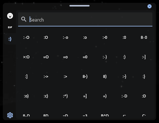 On the left hand side, we can choose between emojis, GIFs, and emoticons. At the bottom left is the settings wheel.