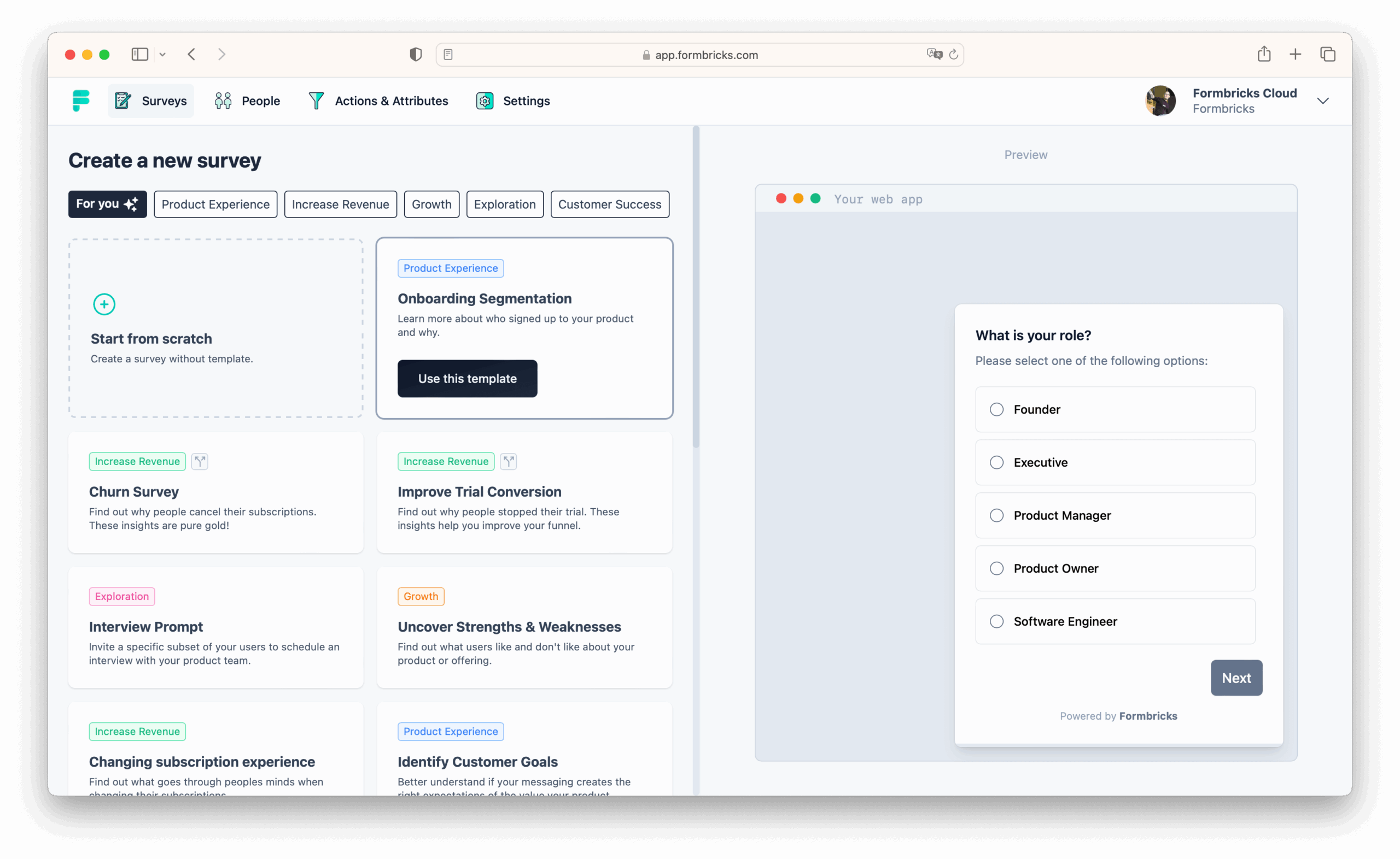- Create conversion-optimized surveys with our no-code editor with several question types.
