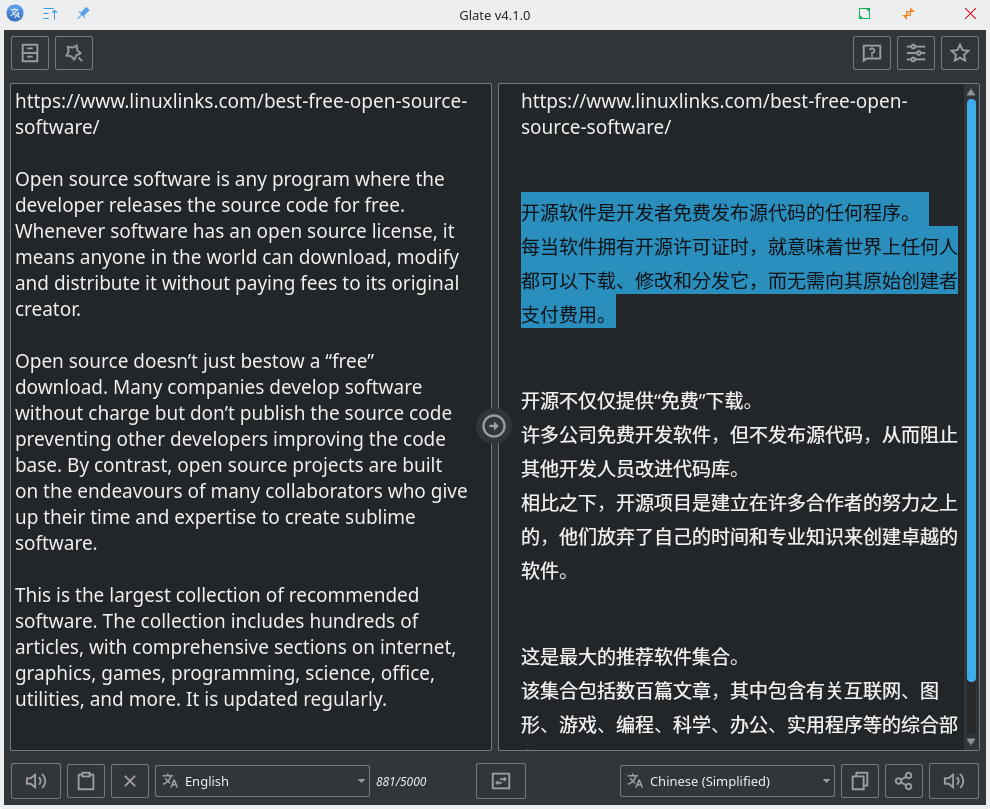 Glate is a desktop application for Linux that provides text translation and text-to-speech capabilities using Google’s translation services. It offers a straightforward interface for translating text between a wide range of languages while also allowing users to listen to pronunciations or generate speech audio files. The application is designed for everyday use, combining translation and speech synthesis into a single, lightweight tool.