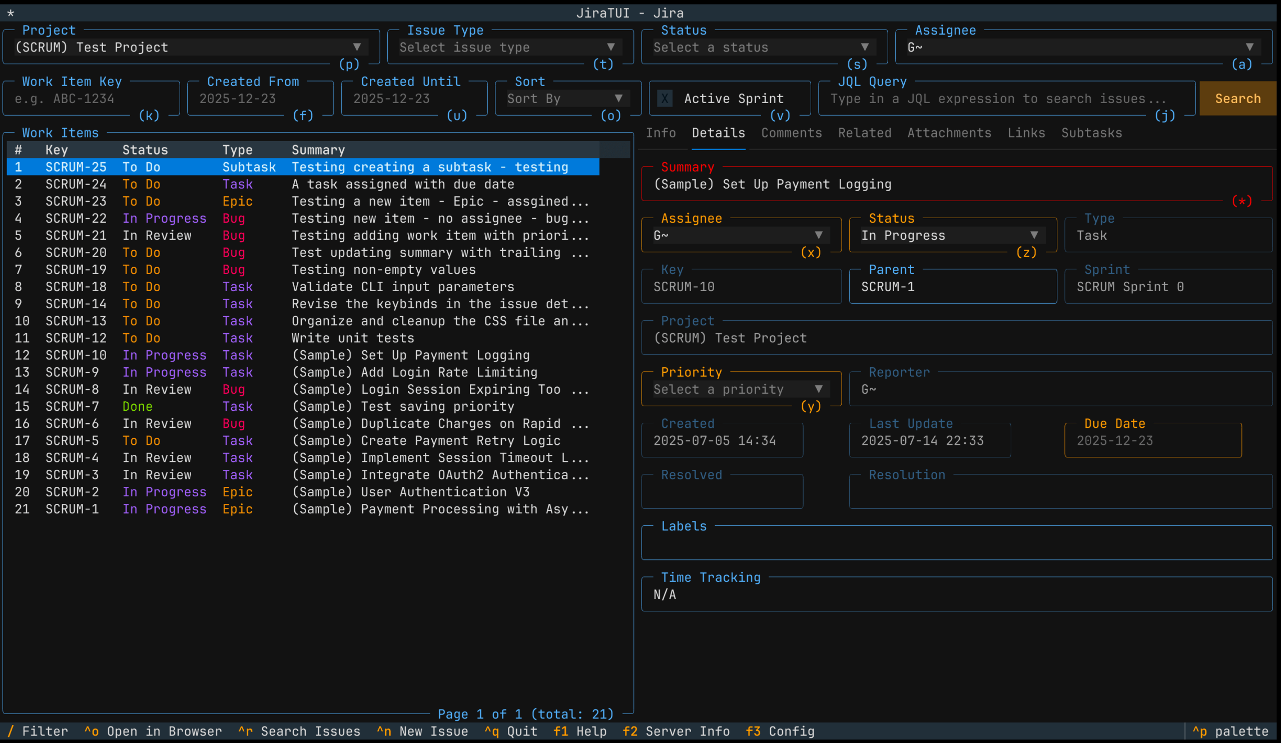 JiraTUI is a Text User Interface (TUI) for interacting with Atlassian Jira directly from your shell.