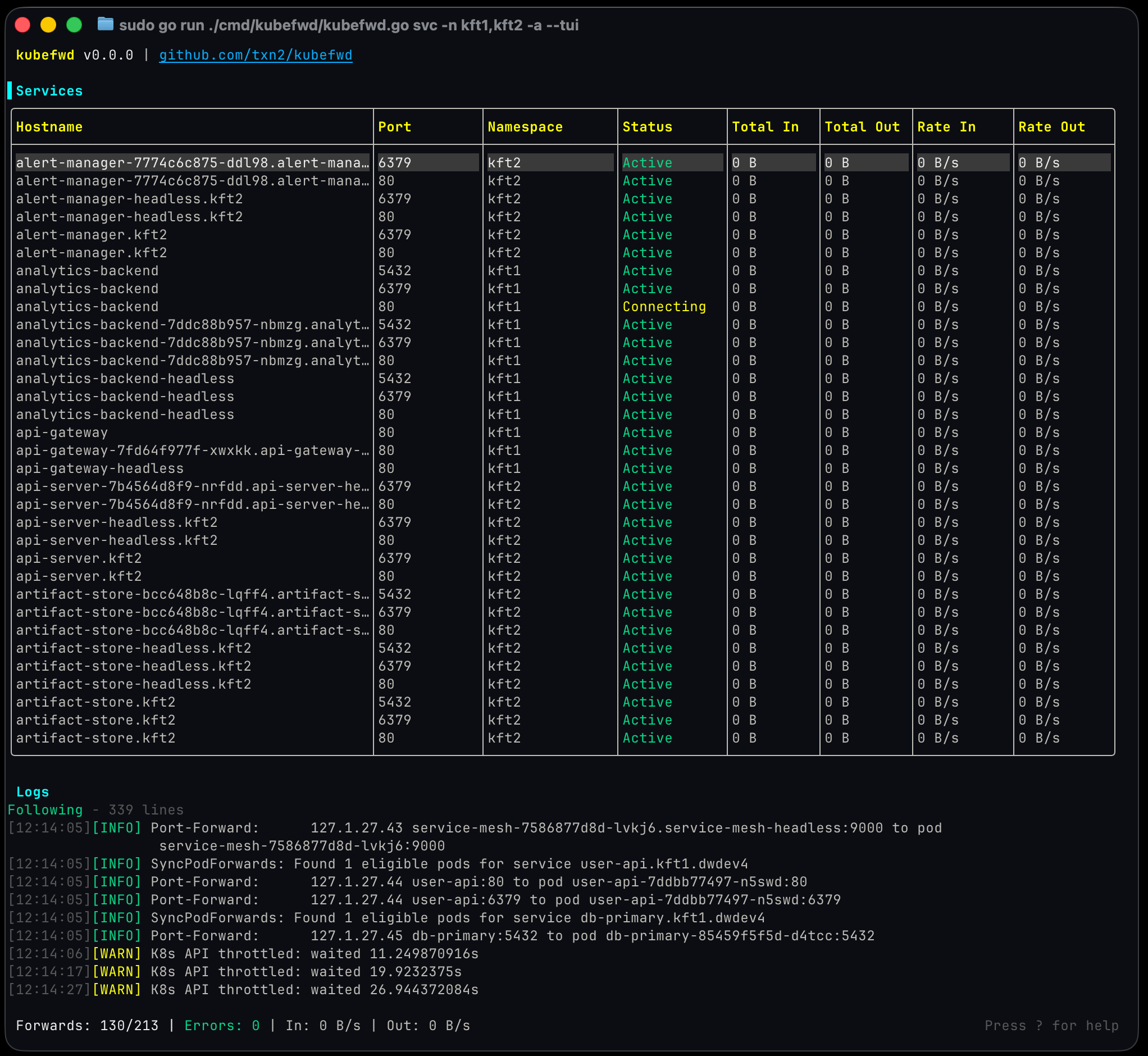 kubefwd enables developers to work on their local machine while seamlessly accessing services running in a Kubernetes cluster. If you’re building a new API that needs to connect to a database at db:5432, an auth service at auth:443, and a cache at redis:6379, all running in your development cluster, kubefwd makes them available locally by their service names, exactly as they would appear in-cluster. No environment-specific configuration, no local service setup, no Docker Compose files. Just run kubefwd and your application’s existing connection strings work.