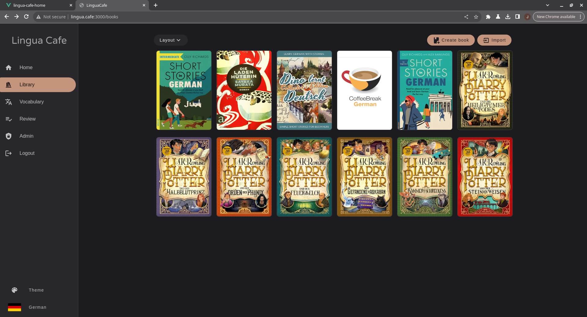 LinguaCafe is a self-hosted web application for language learners that helps them read foreign-language texts, look up unfamiliar words and phrases, and review vocabulary afterwards.