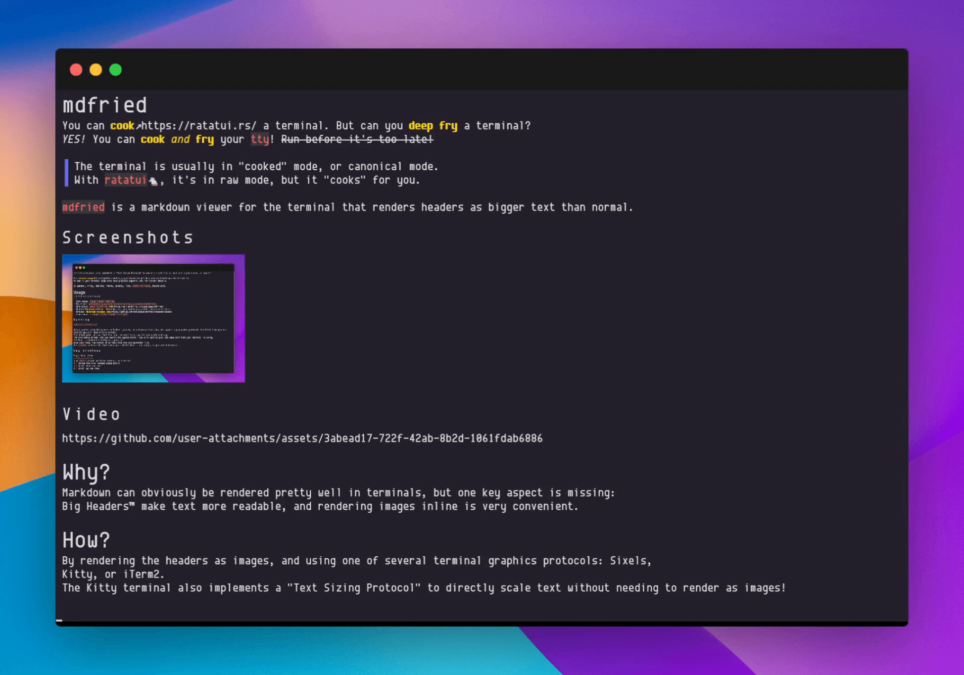 mdfried is a markdown viewer for the terminal that renders headers as Bigger Text than the rest.