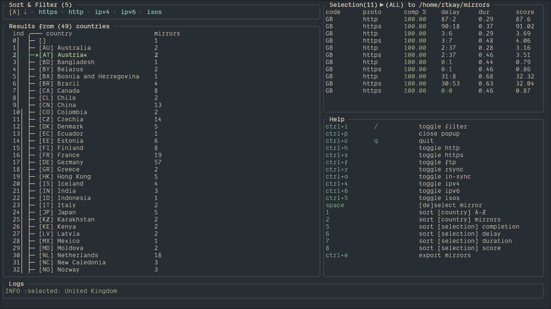 mirro-rs provides a TUI to help you better visualise managing your mirrorlist.