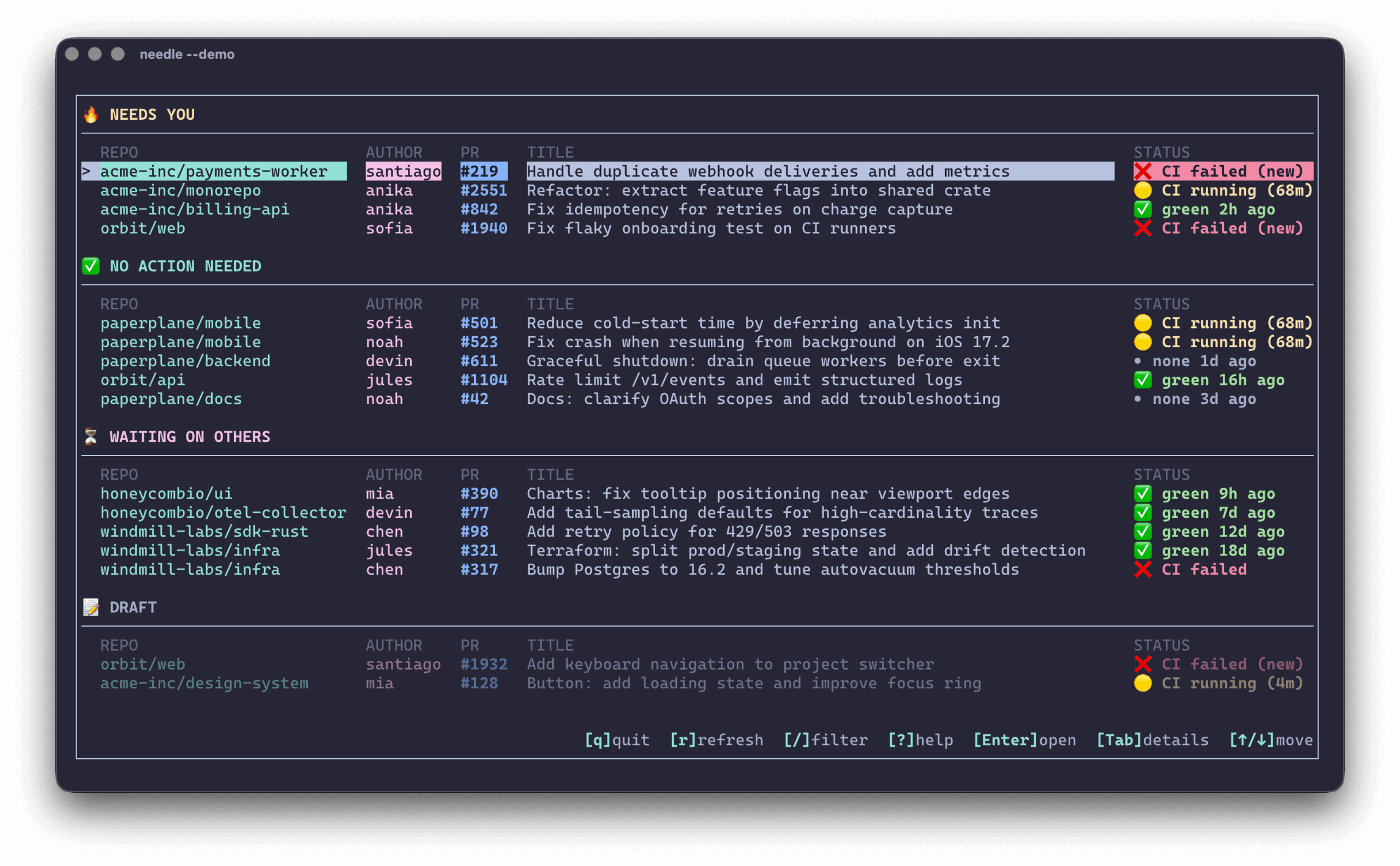 needle is a TUI that shows the few PRs that need you: review requests, failing CI, and long-running checks.