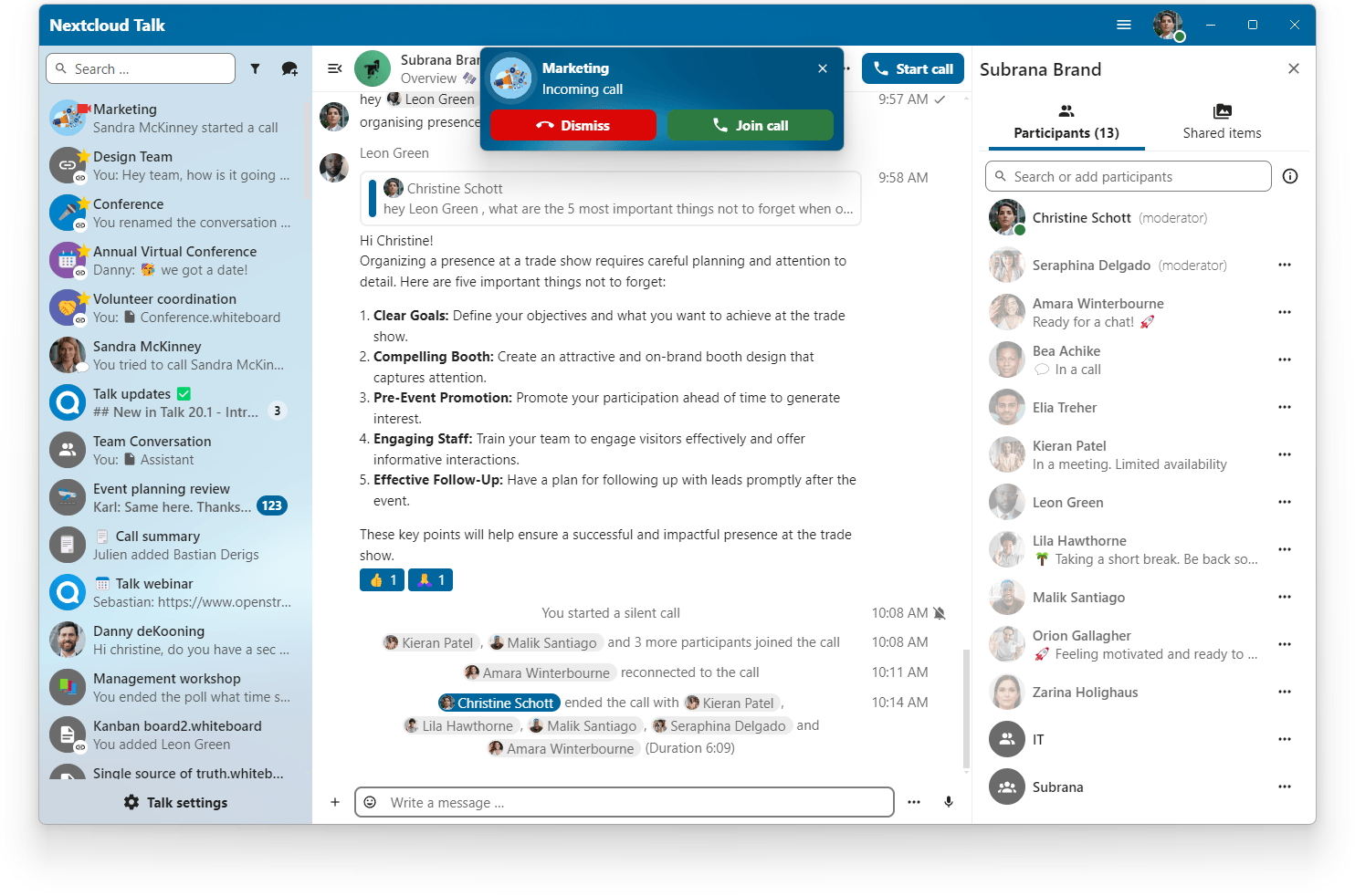 - Lets participants share or upload files from Nextcloud Files or a local device directly in conversations, with support for mentions.