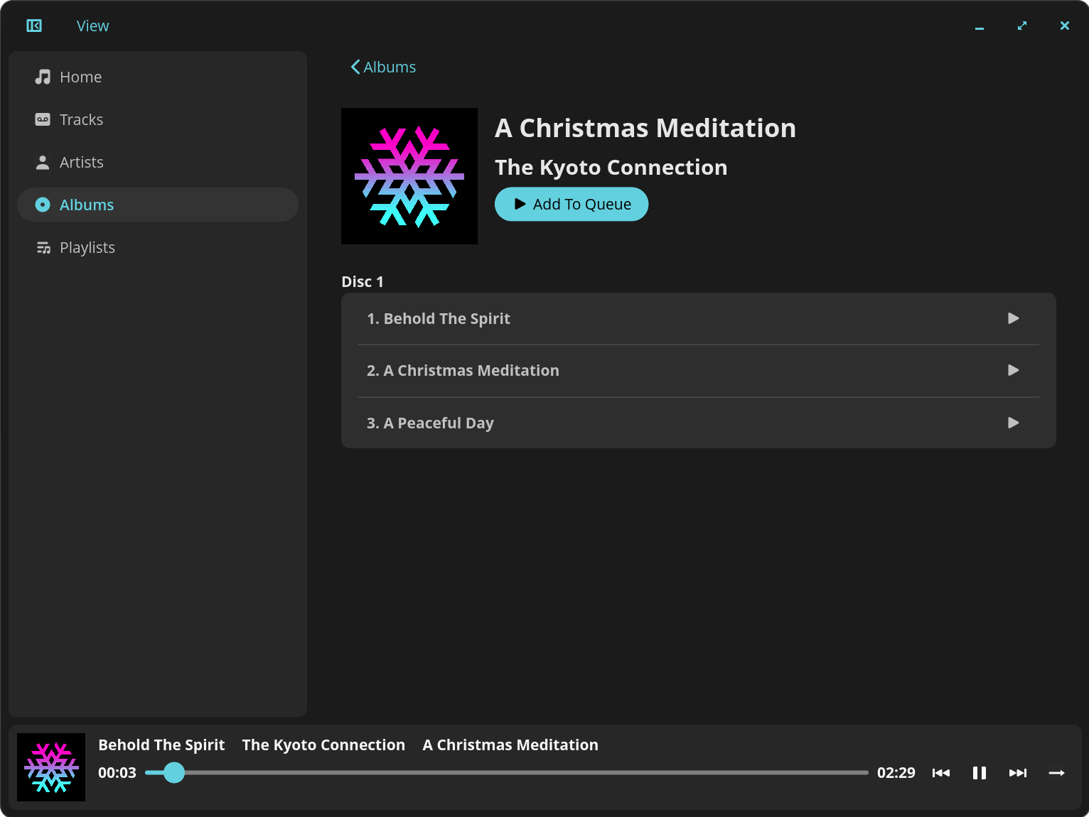 The interface is clean and simple to use. On the left hand side of the interface, you can view your music by individual tracks, albums, or artists. The Home entry lets you view, modify and play the playback queue.
