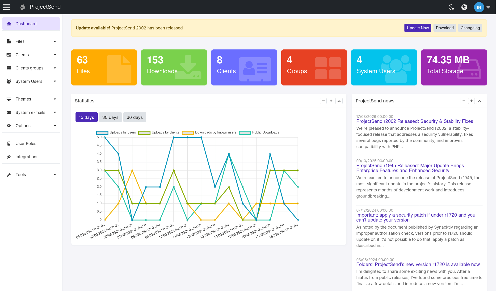 ProjectSend is self-hosted file sharing software for organisations and individuals who need to distribute files to clients while keeping control of their own data.