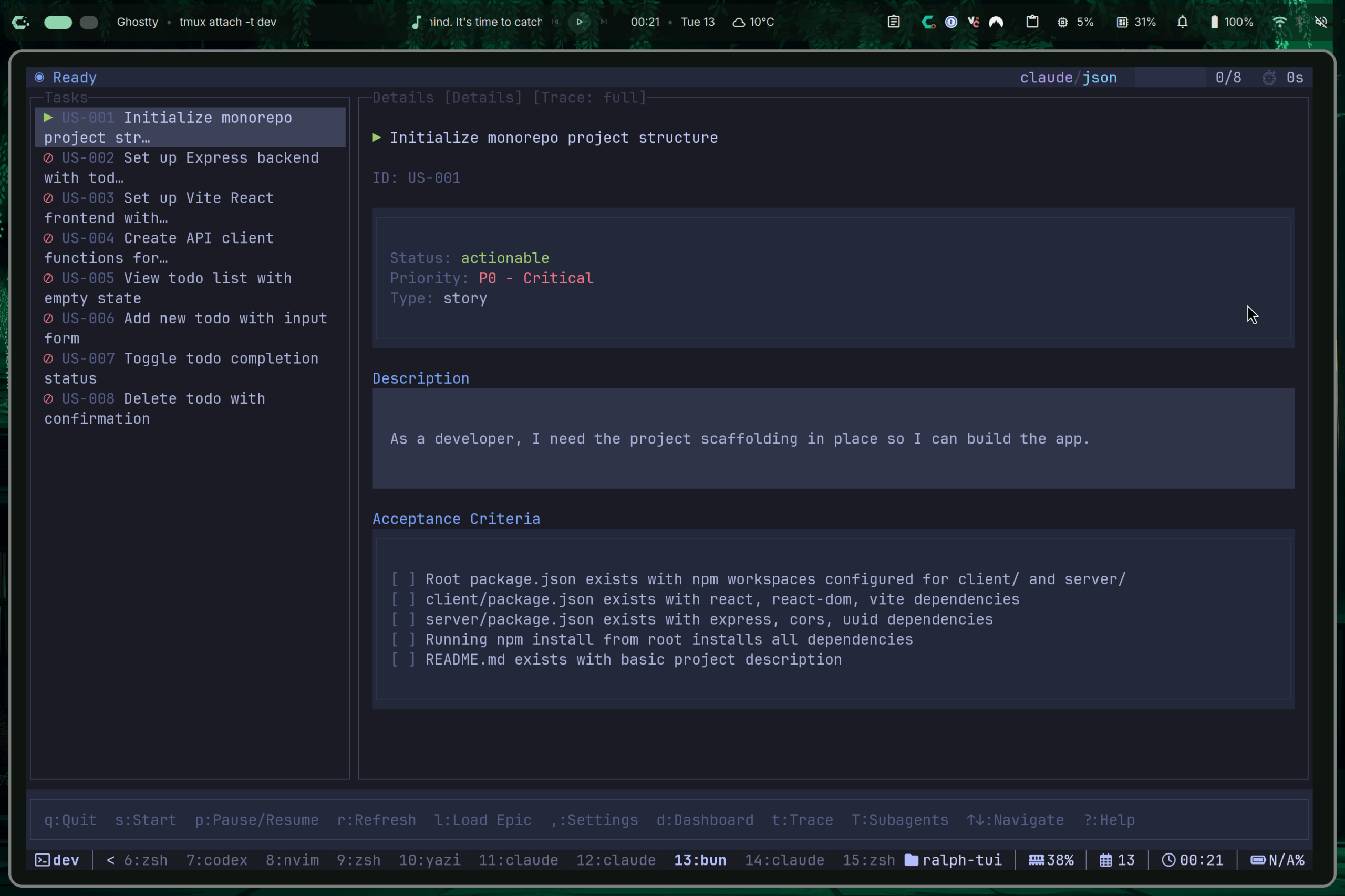 - Real-time TUI: Watch agent output, control execution with keyboard shortcuts.