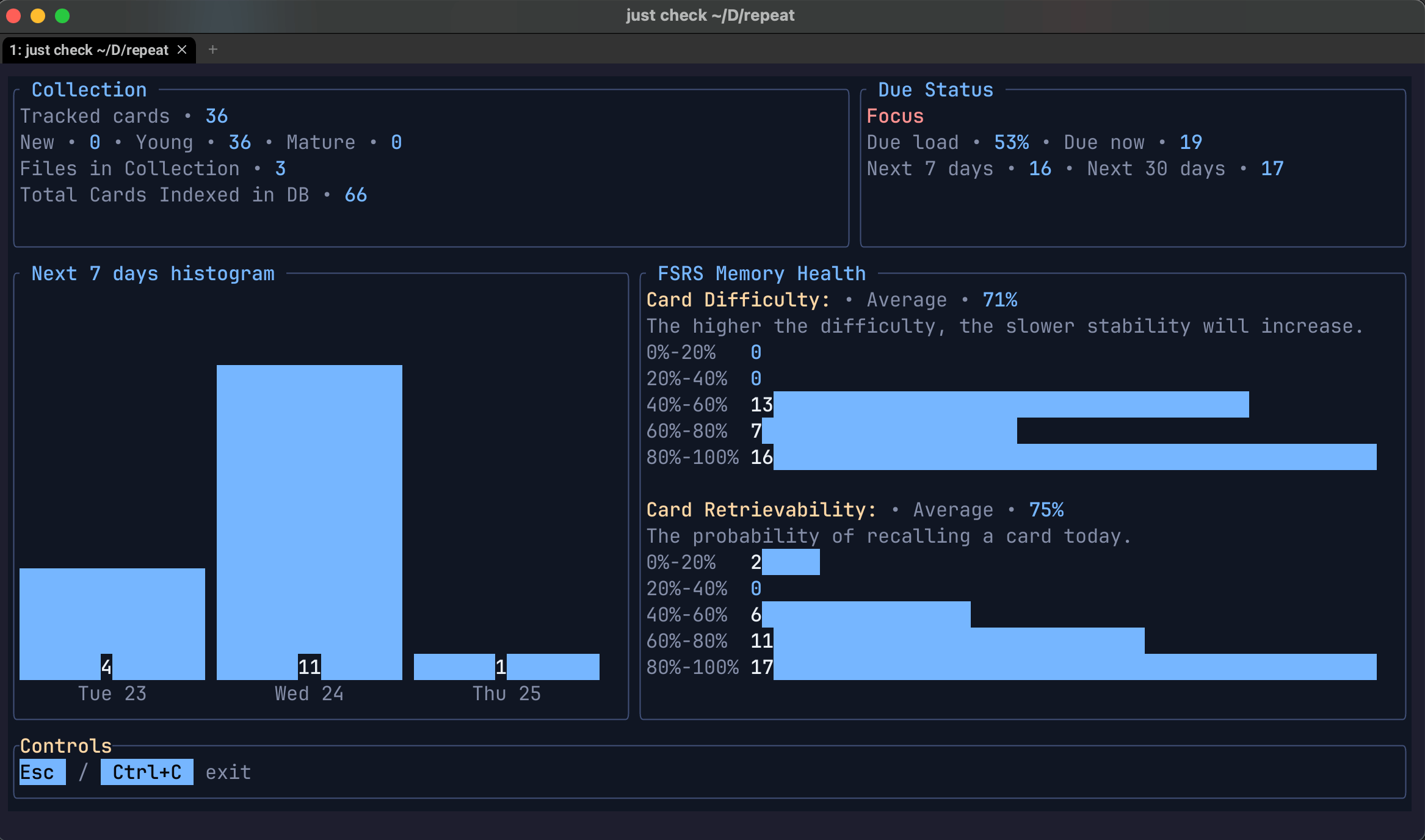 It’s like a lightweight, text-based Anki you run in your terminal. Your decks are kept in Markdown, progress is tracked in SQLite, and reviews are scheduled with Free Spaced Repetition Scheduler (FSRS), a state-of-the-art algorithm targeting 90% recall.