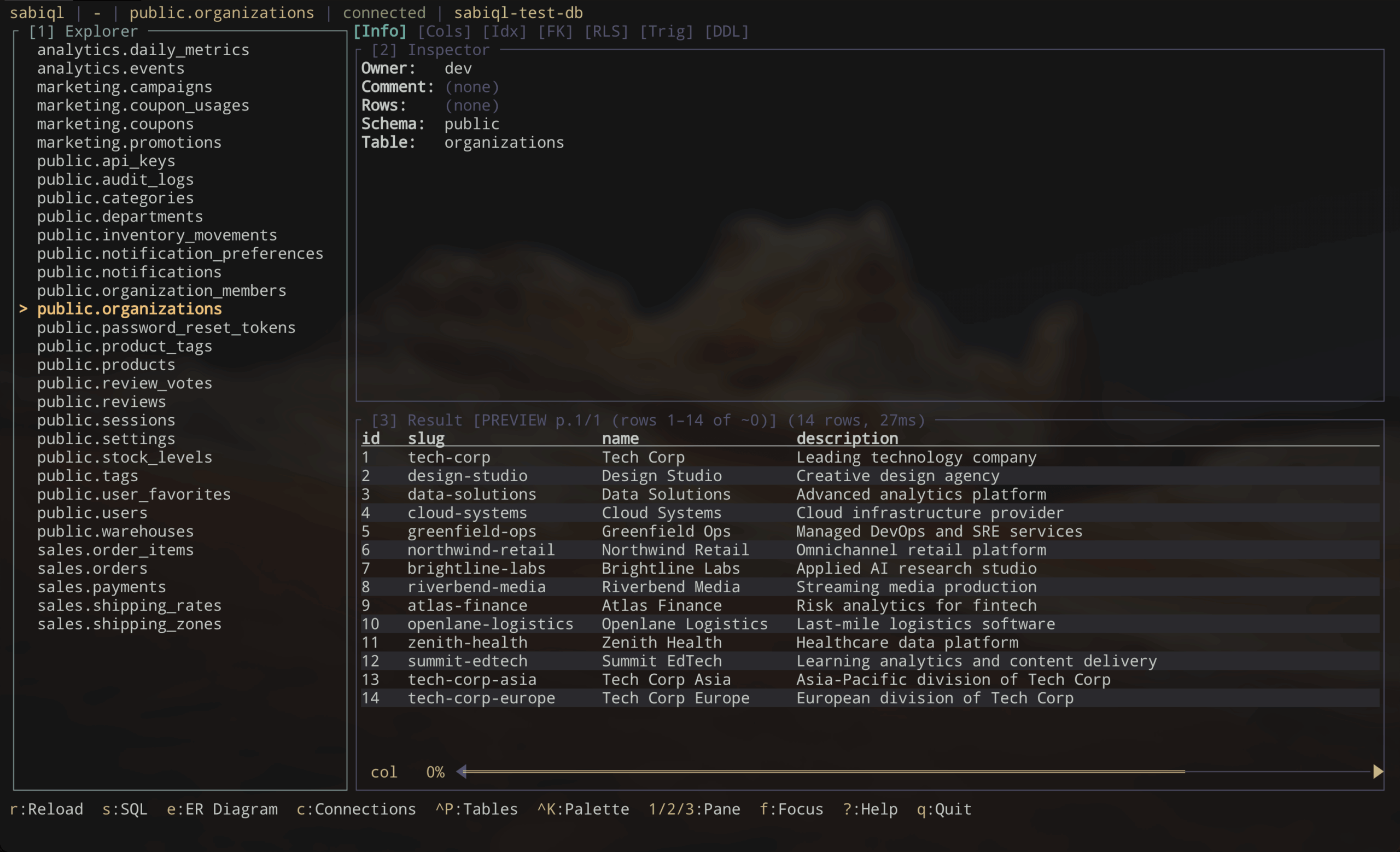 sabiql wraps your existing psql CLI — no Rust database drivers, no connection pools, no extra dependencies. Point it at your database and get a full-featured TUI with vim-like keybindings.