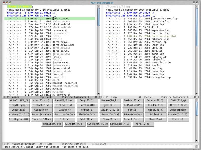 Sunrise Commander is a portable file manager for the Emacs text editor. It’s built atop of Dired and takes advantage of all its power, but also provides many handy features of its own.