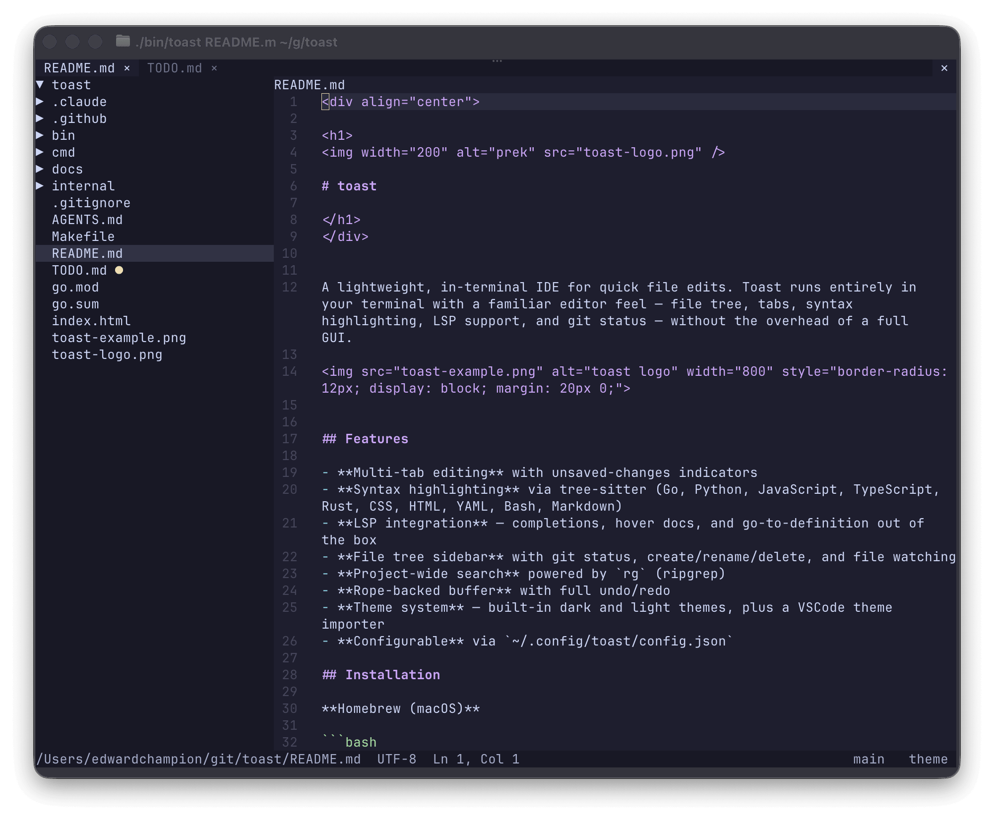Toast is a lightweight terminal-based IDE designed for quick edits without leaving the command line.
