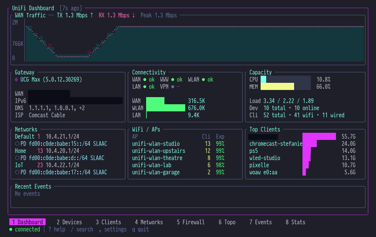 It is designed to let administrators manage and observe their networks without relying on the web interface, bringing day to day controller operations into a single terminal workflow. The project covers routine network administration tasks such as working with adopted devices, connected clients, VLANs and subnets, WiFi information, live events, and controller data across different UniFi environments.